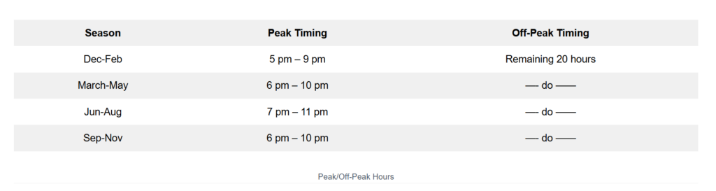 high, it is referred to as peak hours. It is a time when most users use electricity. It increases the burden on the national grid, resulting in higher prices. These hours change with the weather changes. Here is a table representing the peak hours for different seasons of the year: